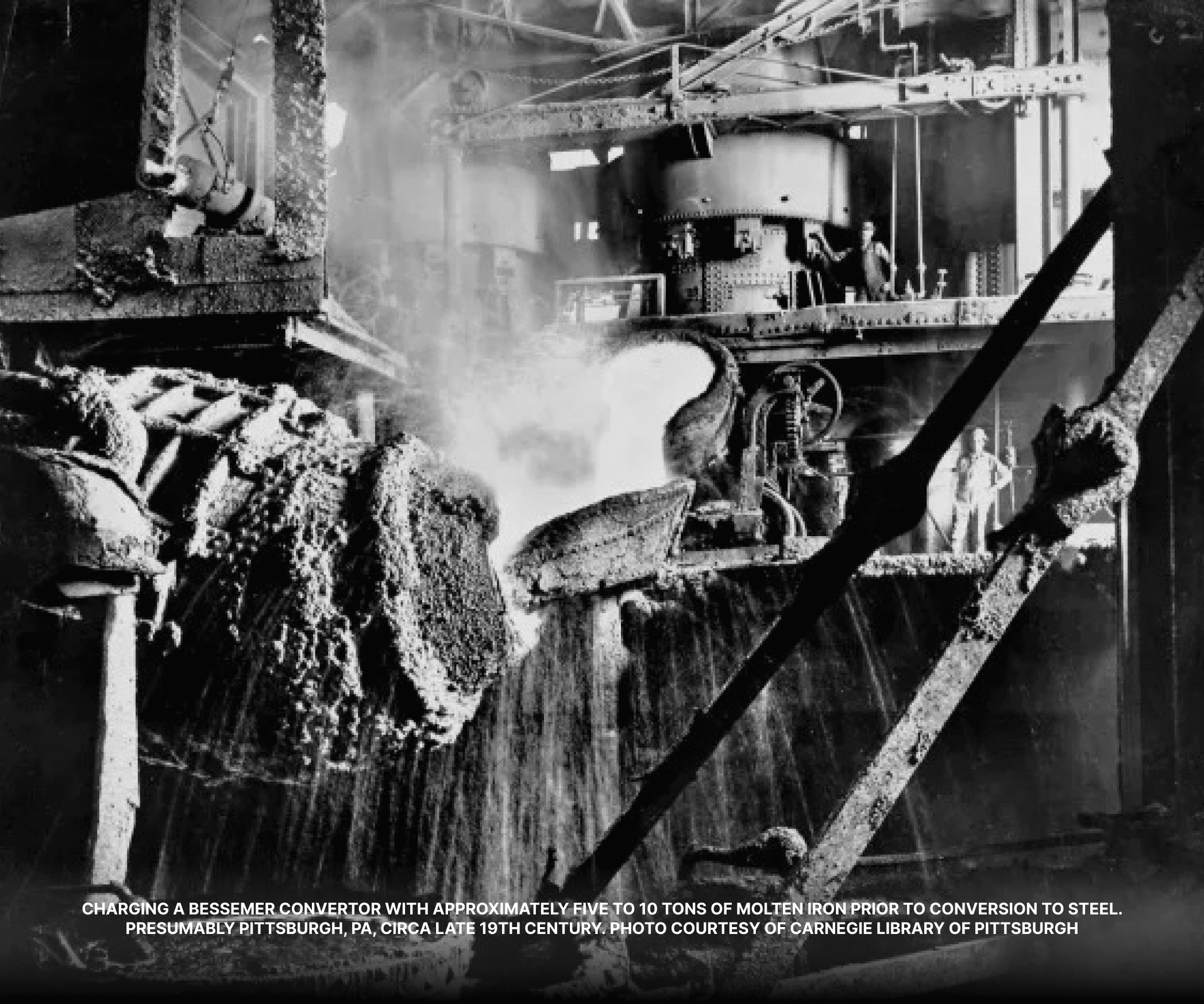 The breakthrough was in adopting the Bessemer process, developed by Henry Bessemer in the 1850s. Before the Bessemer process, steel existed. But it was slow, expensive, and inconsistent to make. Production took days or weeks. Quality varied batch to batch. Steel was effectively a luxury material and undifferentiated from iron.