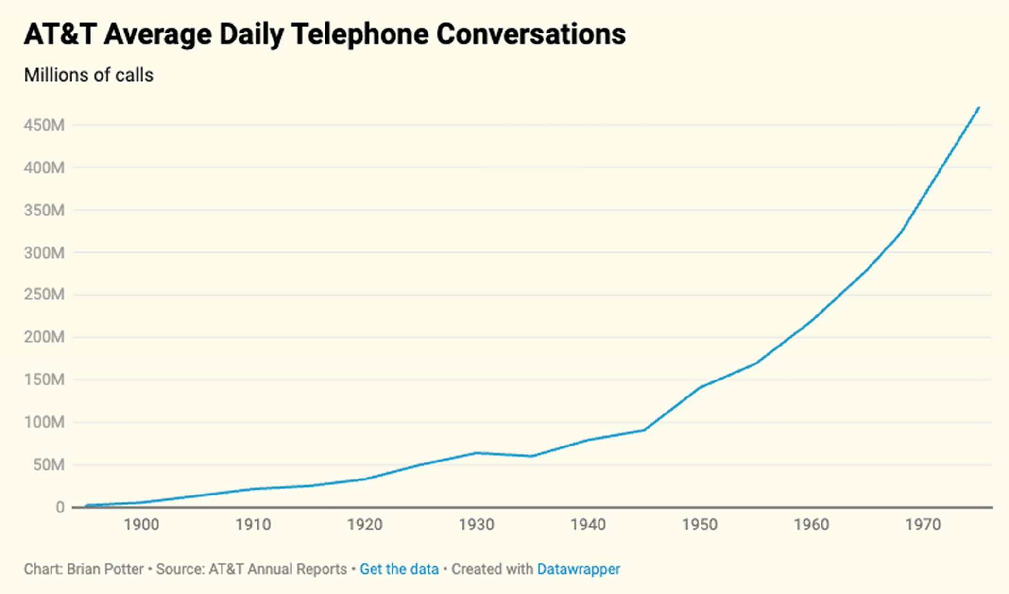 Only after coaxial physical networks were in place did downstream industries emerge. Brian Potter of Construction Physics made a similar case highlighted in this chart.