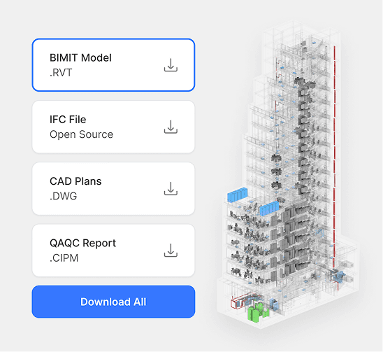 Download as-built files in industry-accepted file formats like RVT, CAD, IFC, and more.
